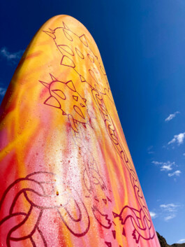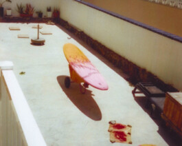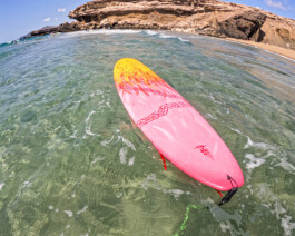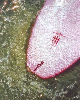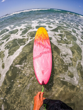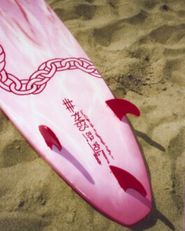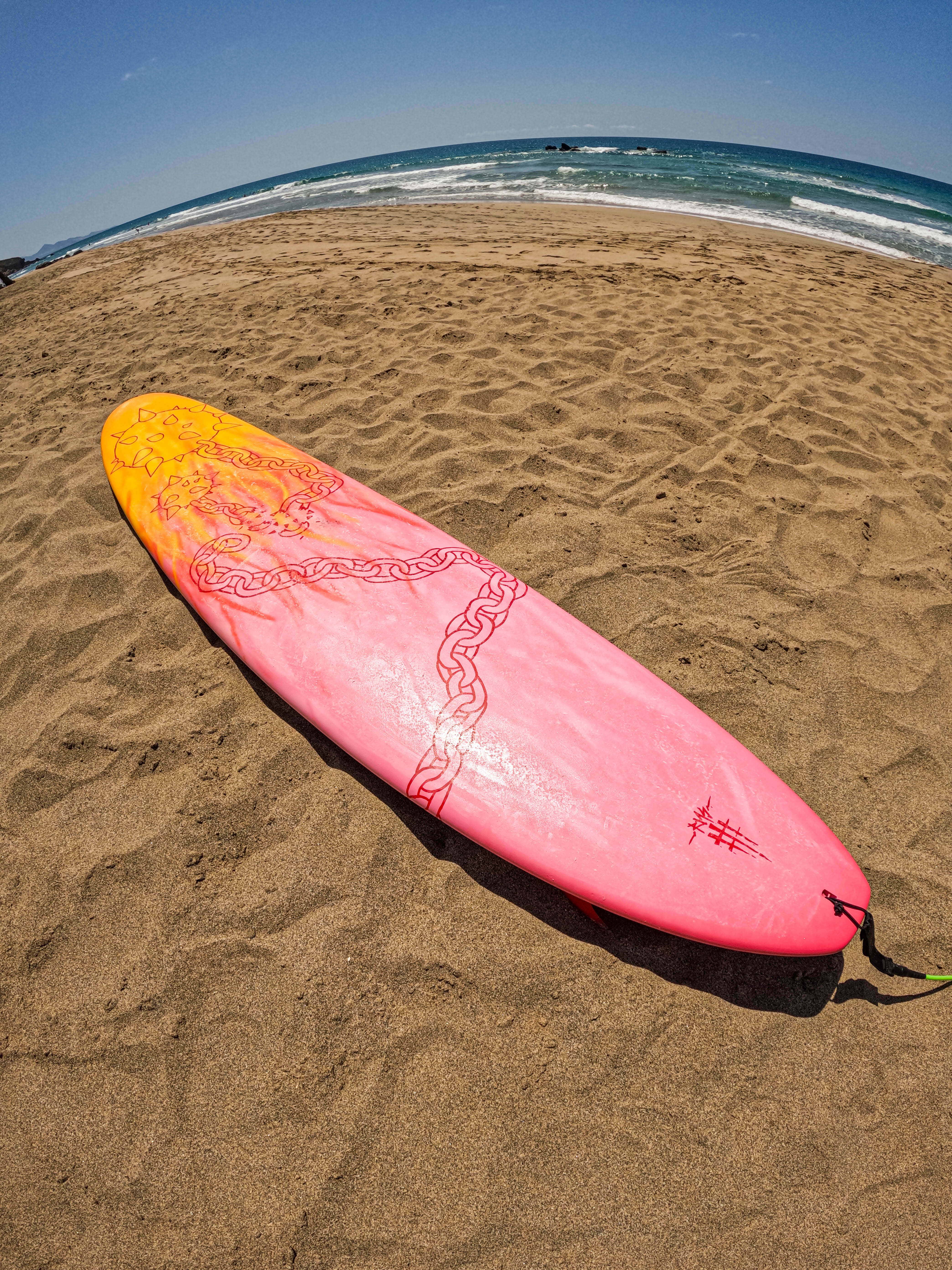 Since I can remember I am swimming. If I had an element it would probably be water. Big waves and loud winds are some of my early core memories. Neoprene suit smell and epoxy resin mixing in with some ice-cream flavor and fresh applied sunscreen. Since I can remember I am surfing and always will be. This background brought me to the situation of repairing and recycling a surfboard. I painted it with hot pink flames because sharks only like white or red they say. It is intended to be used in small to medium waves.